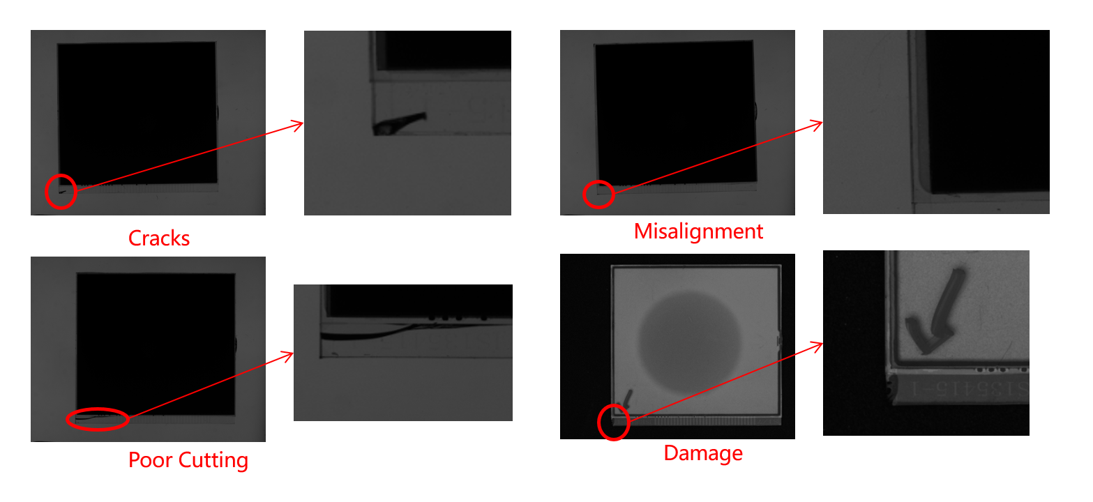 Defect DetectionDefects including scratches, fibers/lint, internal contamination, bubbles, foreign particles, cracks, poor cutting, misalignment, white spots, water marks, breakage, etc.